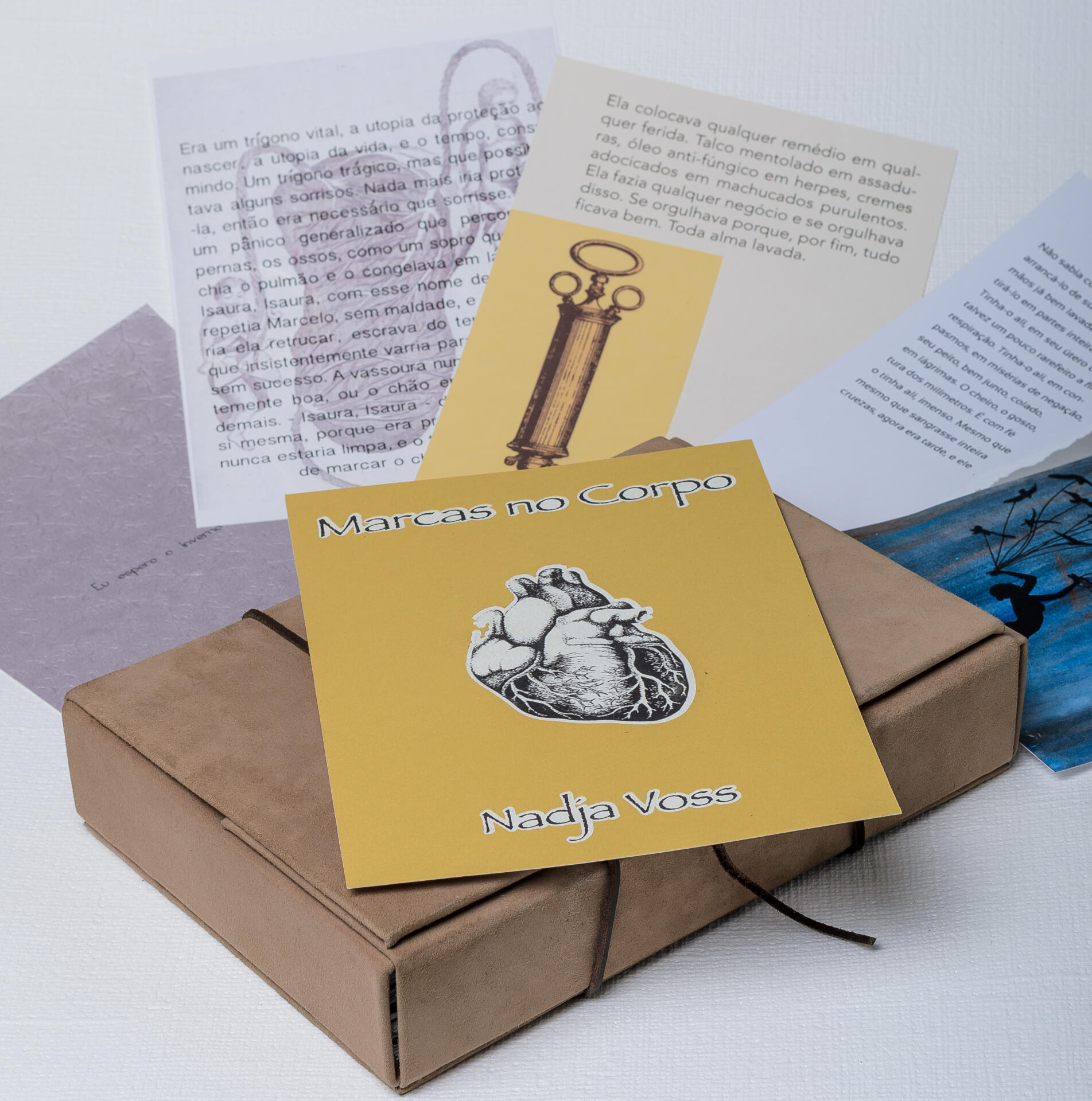 Marcas no Corpo é um livro de 2013, híbrido entre Literatura e Artes Visuais, ancorado na sinestesia e na ideia de repassar ao leitor o máximo possível do contido nos manuscritos. Livro em versão única composto de 90 micro contos e poemas, em páginas individuais guardadas dentro de uma caixa em encadernação japonesa tradicional.